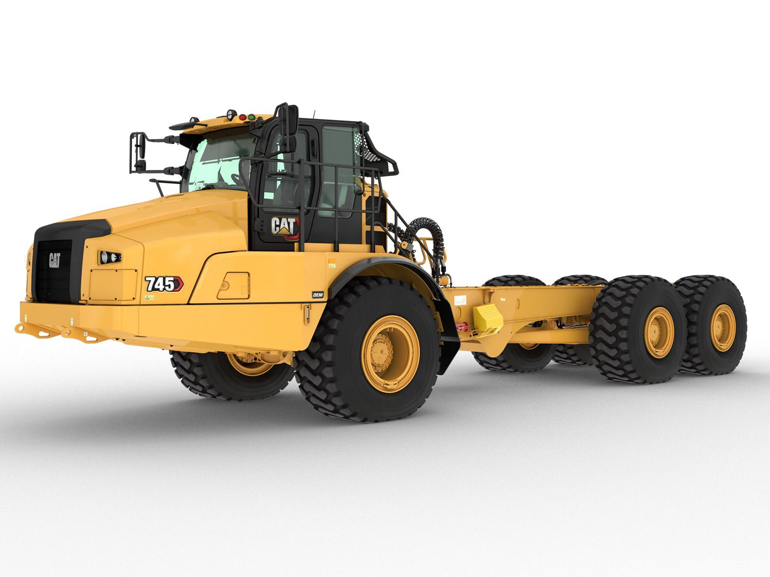 The Cat® OEM 745 Bare Chassis is available in both standard and long wheel base. With up to a 49.9 tonnes (55 tons) capacity, the 745 bare chassis offers proven reliability, durability, high productivity, superior operator comfort and lower operating costs. The long wheel base configuration accommodates longer specialty OEM bodies, while retaining high-quality steering, braking, and ride characteristics.