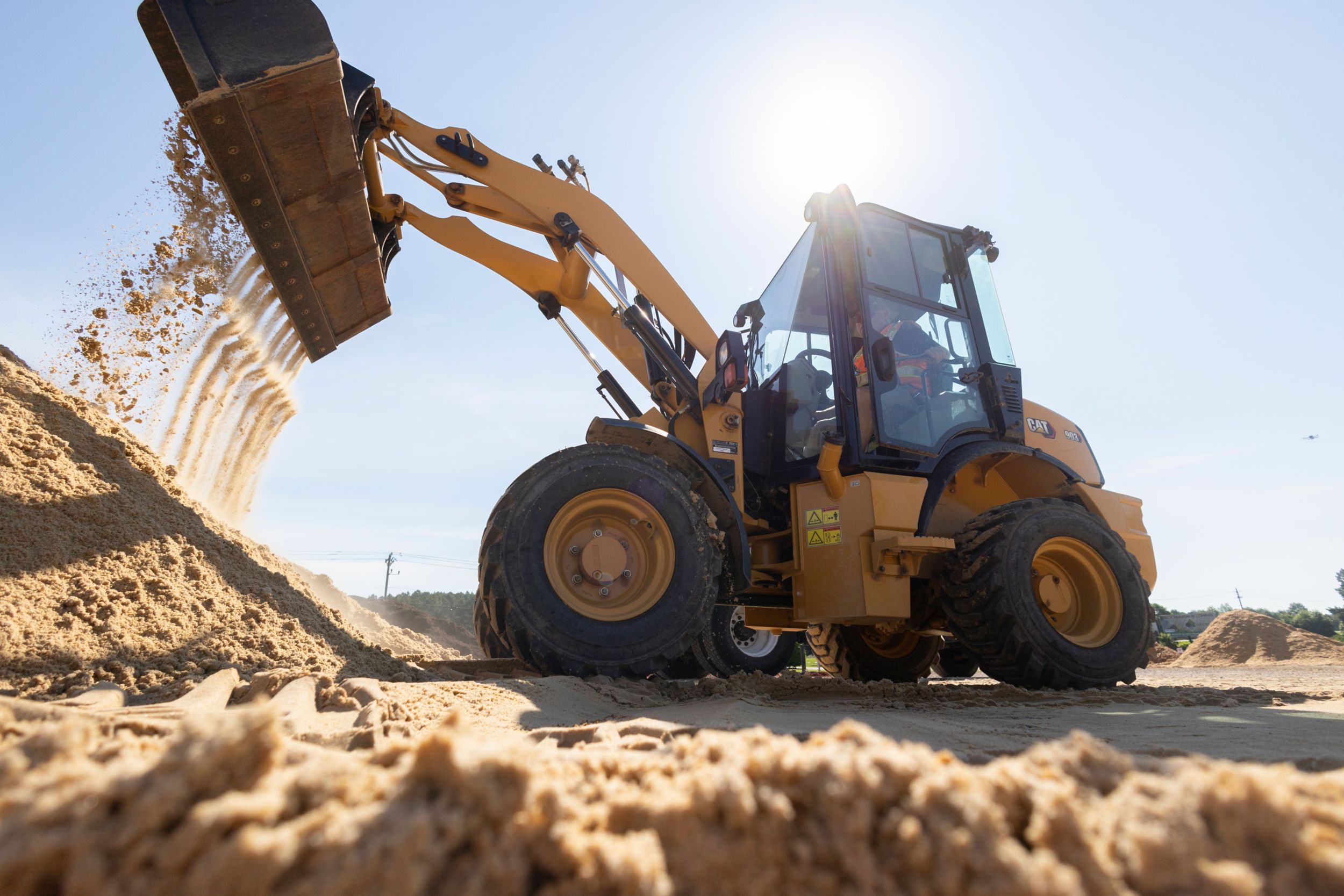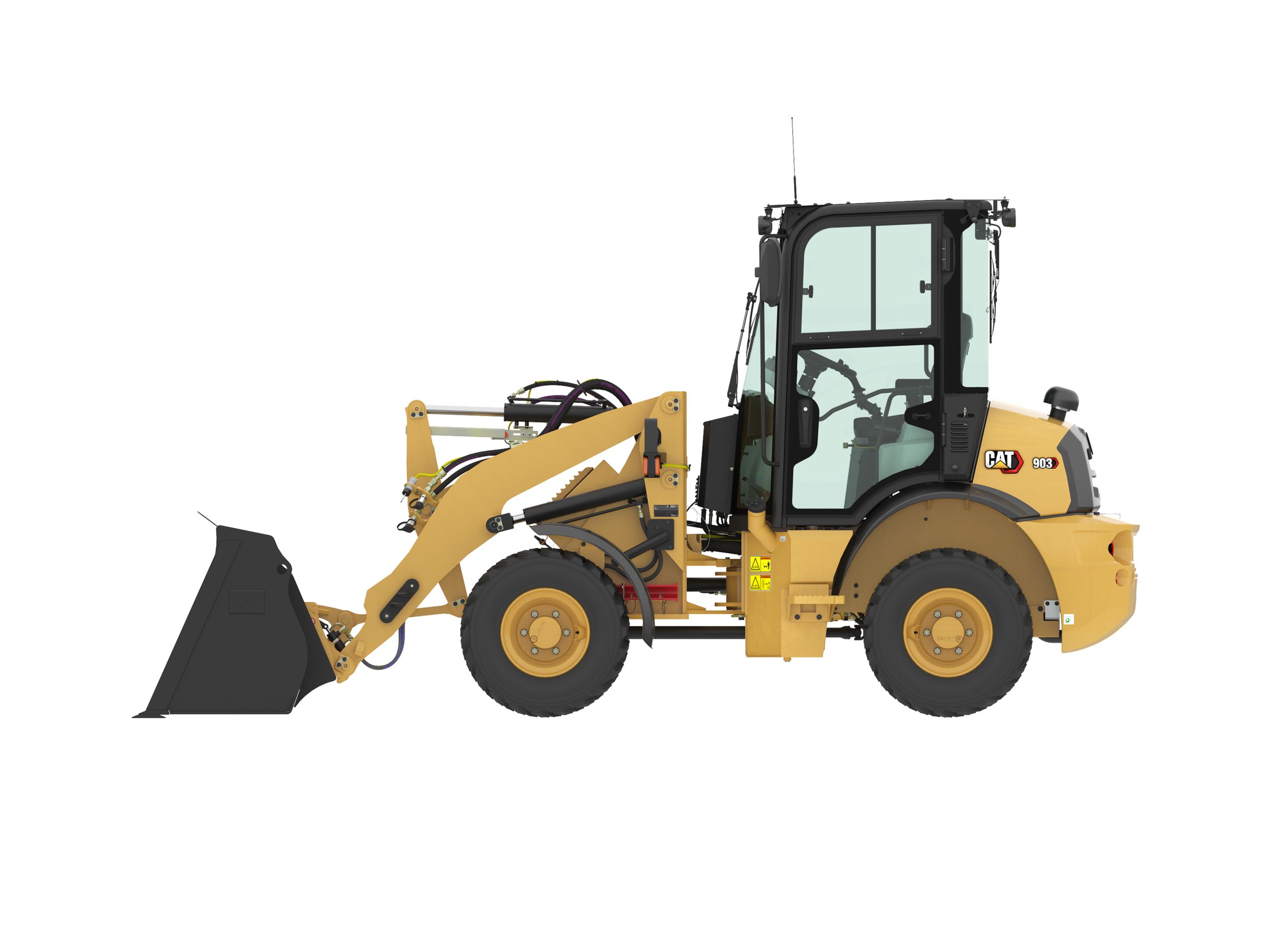 Operators will enjoy all day comfort with a multi-function joystick, spacious leg room, ergonomic pedal positioning, easy entry/exit, and optional speed sensitive ride control. The all-new seat provides optimal comfort, while featuring yellow adjustment touch points that make finding that perfect seat position easy. The minimal engine overhang provides excellent rear and corner visibility, making the 903 easy to operate in confined areas.