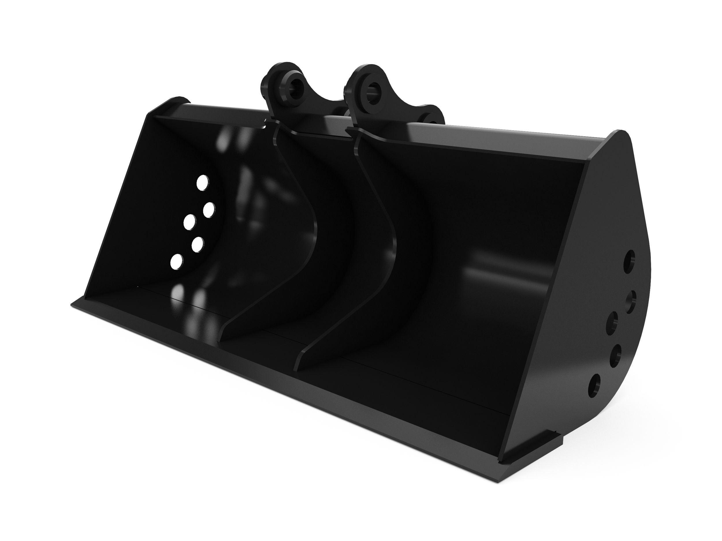 Versatile bucket for applications such as cleaning wide trenches, loading materials, grading, dressing slopes and more.