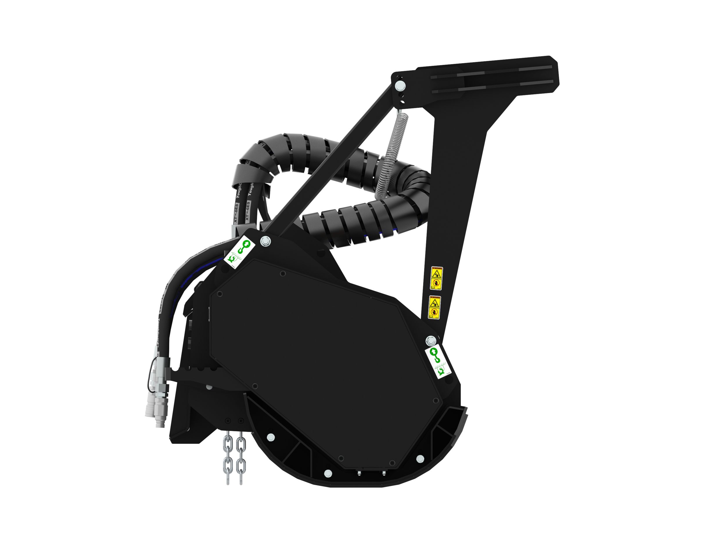 Hydraulically operated front hood is standard. Linkage is enclosed within mulcher frame on High Flow models. Quick to open and close door allows for finer finished material to be produced from cutting all types of vegetation.