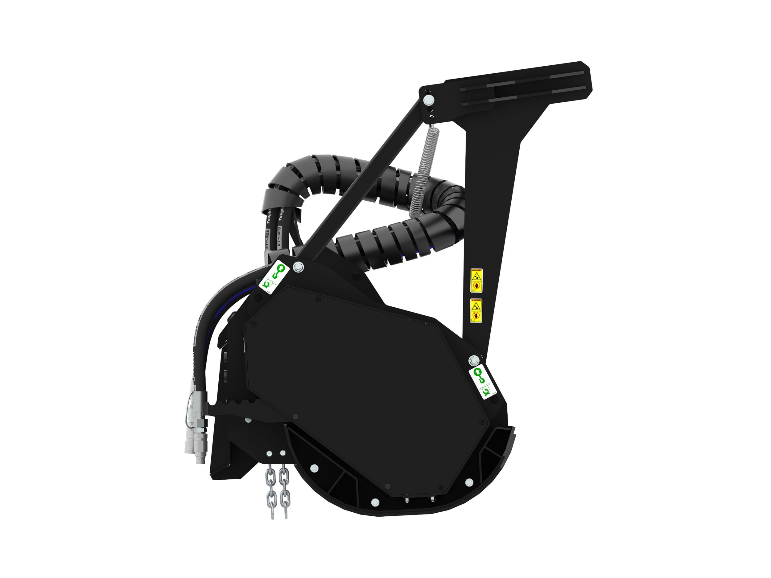 Hydraulically operated front hood is standard. Linkage is enclosed within mulcher frame on High Flow models. Quick to open and close door allows for finer finished material to be produced from cutting all types of vegetation.