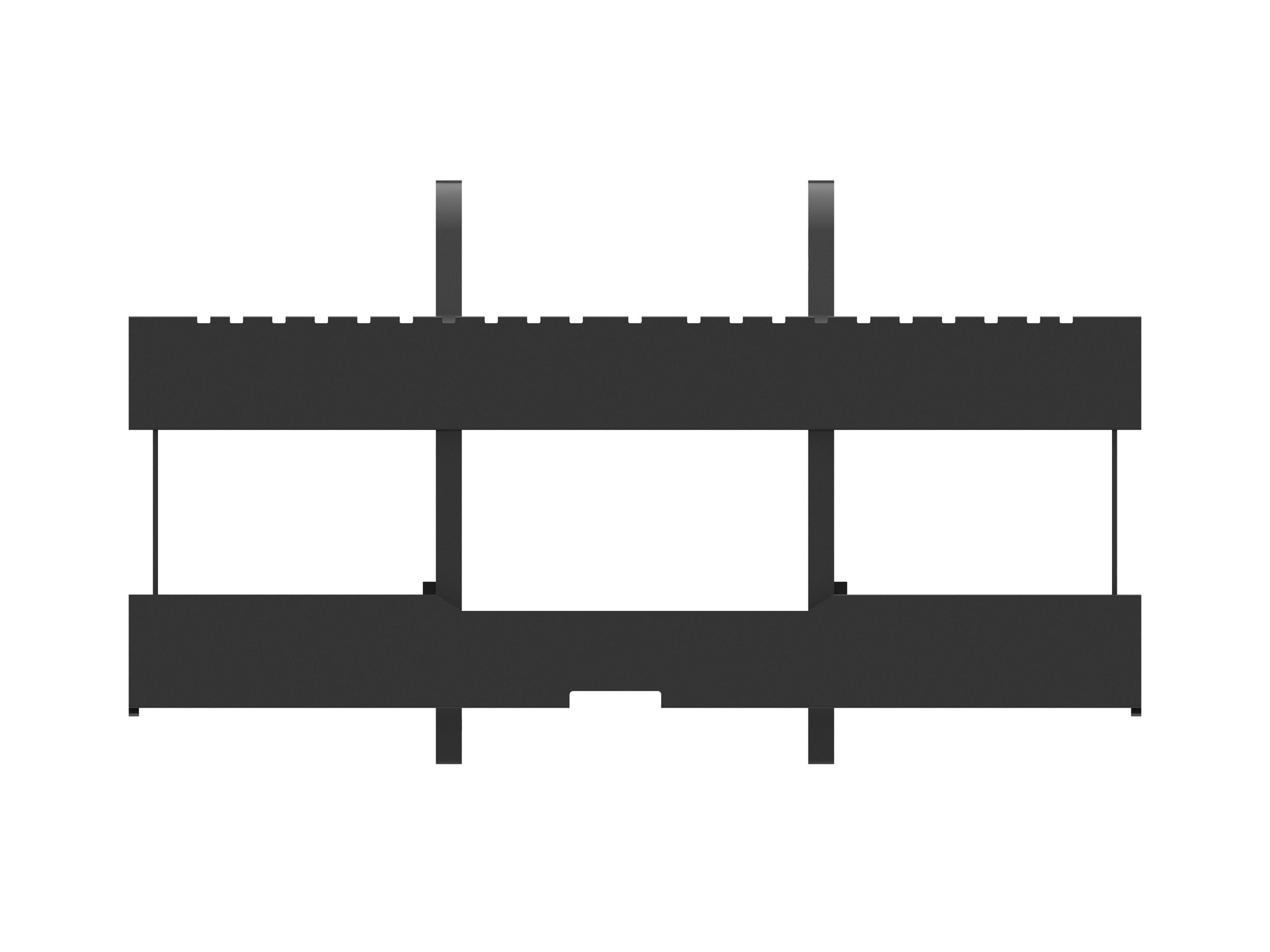 Notched rail-type carriage design allows fork tines to be easily re-spaced or changed and locked into place.