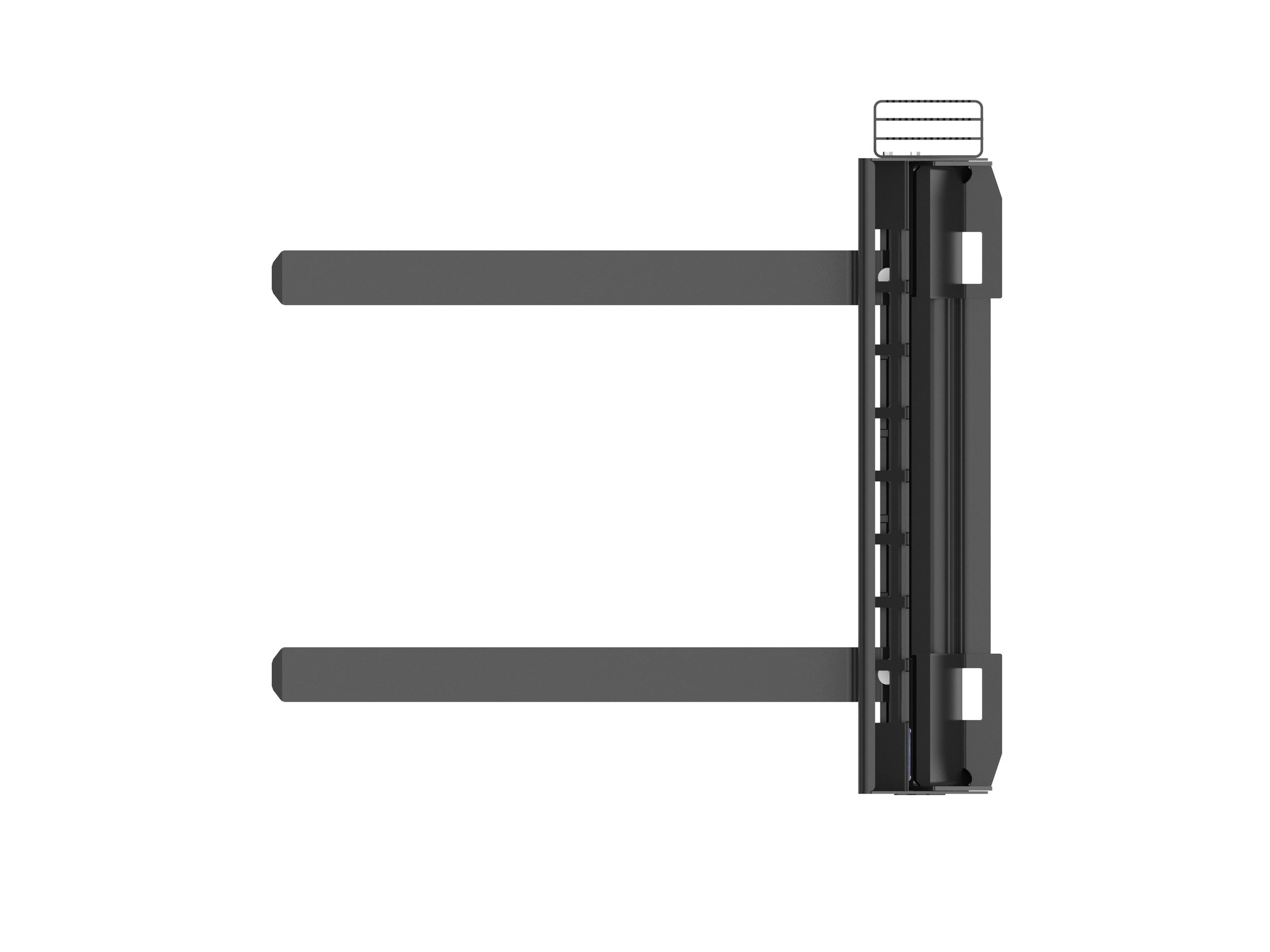 Notched rail-type carriage design allows fork tines to be easily re-spaced or changed and locked into place.