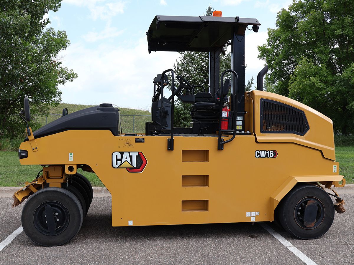 The Cat® CW16 is a standard 9-wheel Pneumatic Roller with an operating weight range of 5200 kg to 15 000 kg (11,164 lb - 33,069 lb) and compaction width of 1754 mm (69"). An optional 11-wheel option increases the compaction width to 2132 mm (84"). Equipped with an efficient Cat engine, this machine delivers smooth, reliable performance on grades and soft base materials.