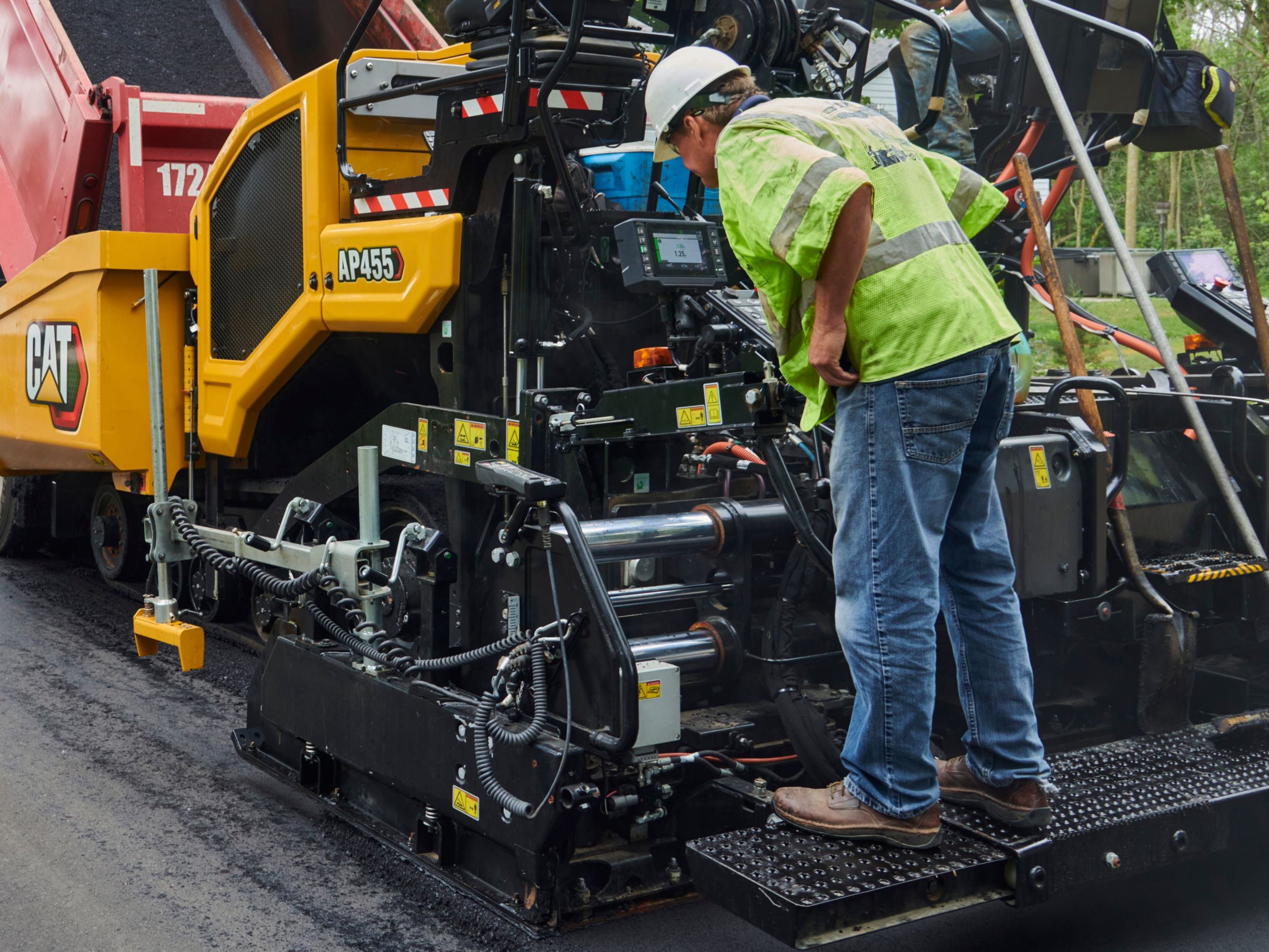 • Screed operating consoles are equipped with mix height adjustment for the augers, providing the ability to modify material flow. When equipped with Cat® Grade Control, conveyor ratio adjustment or conveyor material height can be performed through the display