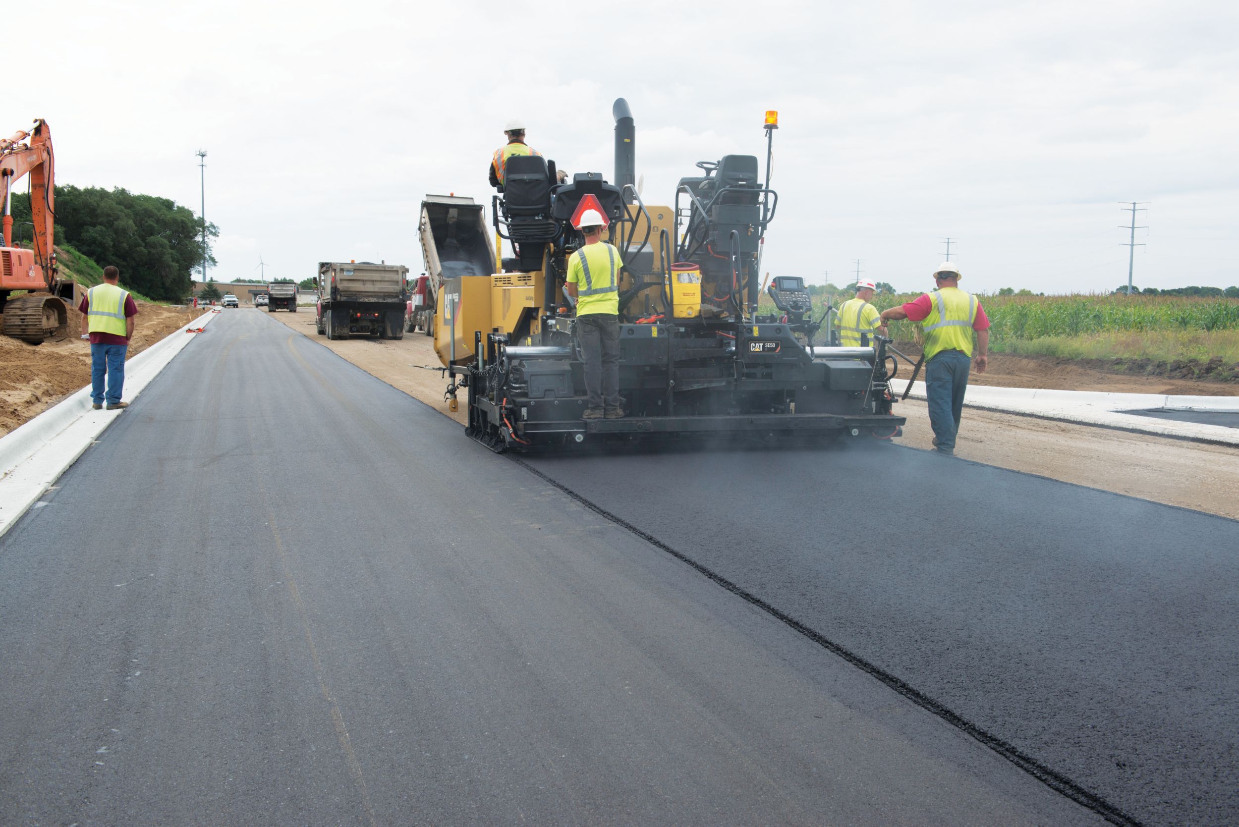 The SE50 V vibratory screed is equipped with rear-mounted extenders and vibratory screed plates. It offers a paving range of 2.55 m - 6.5 m (8' 4" - 21' 4") and excels on highways, parking lots, urban streets and other variable width paving applications.