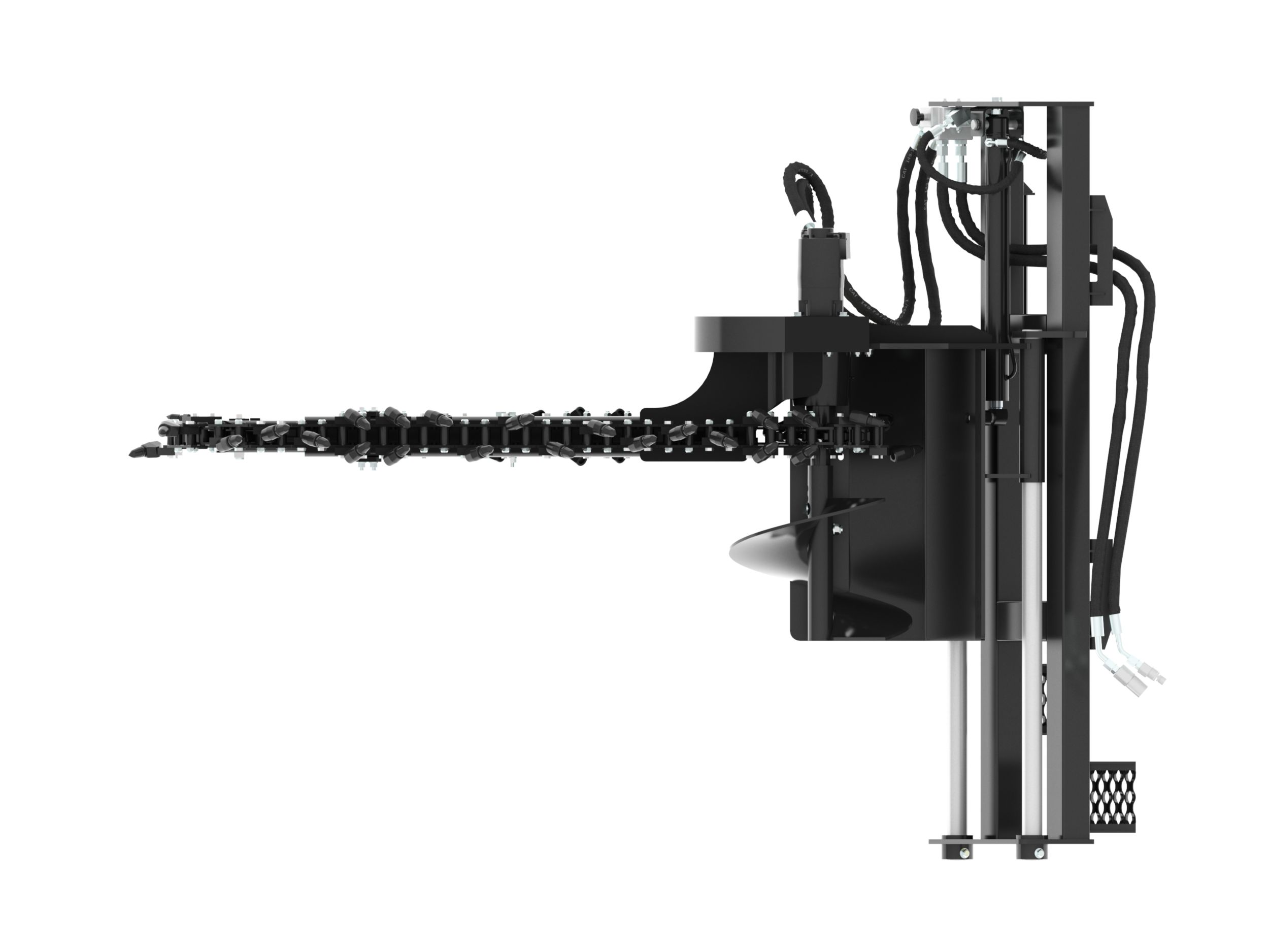 Large diameter bolt-on spoil auger improves loose soil removal from trenching area and allows for quick, easy removal and servicing.