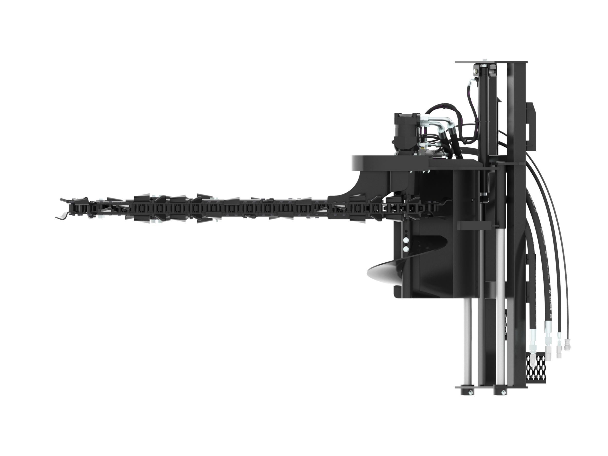 Large diameter bolt-on spoil auger improves loose soil removal from trenching area and allows for quick, easy removal and servicing.
